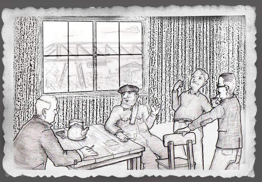 El centro de reunión para los choferes de las grúas del puerto, era un cuartito con una ventana al rio para ver la llegada de las barcazas que venían del Norte, por el Paraná de las Palmas. Una mesa con 4 sillas de madera, un par de banquetas armadas con despuntes de palos y unas tablas clavadas eran todo el mobiliario y en un rincón, una canilla con agua potable y un hornito eléctrico para calentar la pava para tomar mates. El cuartito del muelle además era visitado por los Apuntadores, que llevaban el control de remitos de descarga y coordinaban donde enviar cada producto que llegaba por el río. Y era el lugar de refugio de los barqueros y camioneros cuando estaban las grúas trabajando. Tres maquinistas por turnos de 8hs y un Supervisor eran más que suficientes para manejar la descarga de las chatas paleras y cargar los camiones que llevaban la materia prima al sector que correspondía.